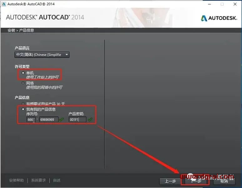在产品信息的输入界面,我们在产品语言这一栏中选择“中文(简体)”,许可类型这里我们选择单机,产品信息这里就很重要了,要输入序列号和产品密钥。在我们下载的CAD文件中找到注册机这个文件夹 打开“安装说明TXT”文档,在安装说明里面找到“安装序列号”和“密匙”,把“序列号”和“密匙”粘贴复制到我的产品信息里面。然后点击下一步