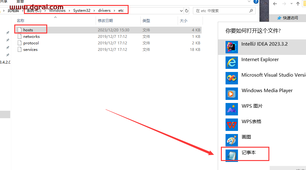 9、打开C盘,Windows\System32\drivers\etc,选择hosts以记事本打开