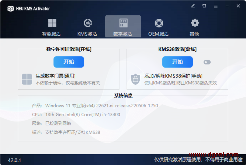 • 查看当前系统信息:网络状态/激活状态,描述便于快速查看是否支持数字许可证/KMS38