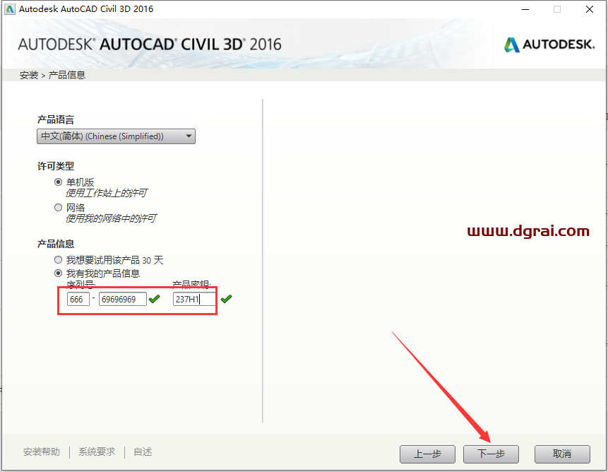 7、输入软件序列号(666-69696969)和产品密钥(237H1),然后下一步