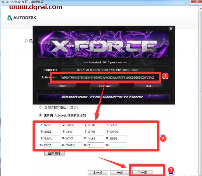16、操作了前面的步骤之后,在注册机【Activation】中就可以获取到激活码啦,将激活码复制到软件【我具有Autodesk提供的激活码】中,然后点击下一步即可