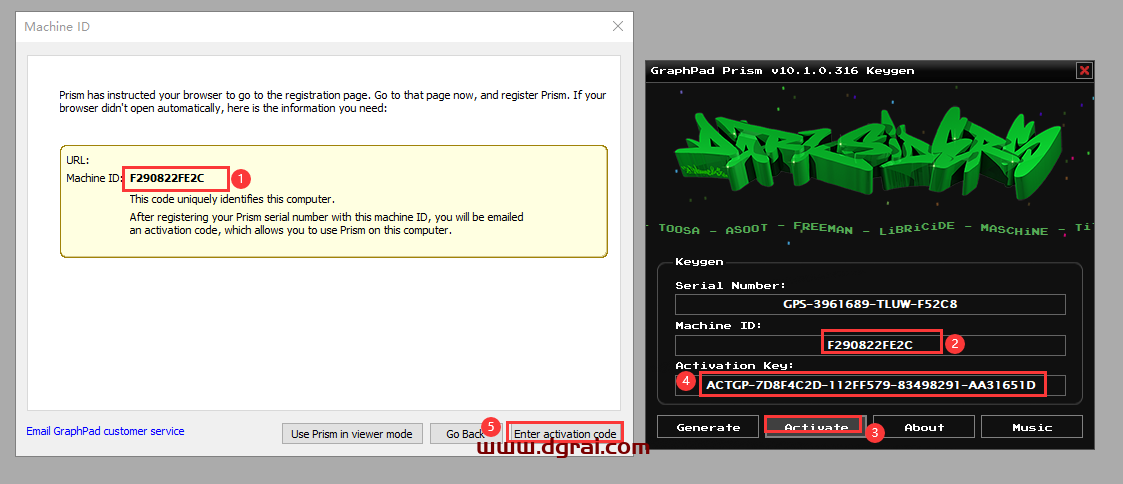 14、将软件页面的Machine lD输入到注册机中【Machine lD】框中,接着点击【Activate】,然后就生成了【Activate key】,最后就是点击【Enter activation code】