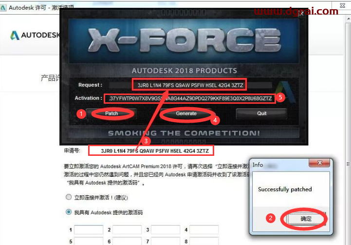 16、开始激活,(1)点击Patch (2)弹出Successfully patched窗口,点击确定 (3)复制软件许可界面的申请号到注册机Request栏 (4)点击Generate (5)生成激活码
