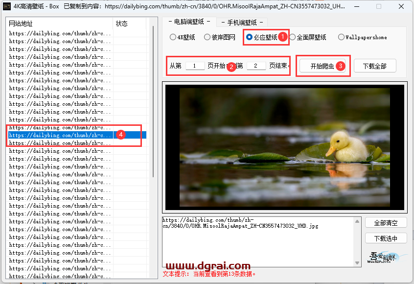 操作挺简单的,先选好壁纸来源,再选定页数,接着点击【开始爬虫】,搞定后,点击左侧的链接就能预览壁纸啦