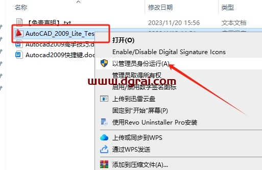 选择安装程序“AutoCAD_2009_Lite_Test.exe”,鼠标右键以管理员身份运行