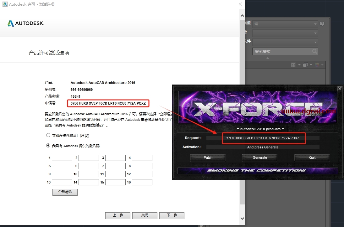 来到产品许可激活选项,获取【申请号】,然后选择【我具有Autodesk提供的激活码】(不要关闭此界面)