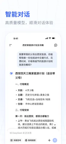 DeepSeek APP 是杭州深度求索人工智能基础技术研究有限公司于 2025 年 1 月推出的免费通用型 AI 智能助手应用,凭借高性能模型和全面功能,上线后快速获得海量用户,软件简介该应用适配 Android、iOS、HarmonyOS 等多系统,还支持网页端使用,软件大小在 9.25 – 37.8MB 之间,无任何广告。它搭载总参数超 6000 亿的 DeepSeek – V3 大模型,采用混合专家(MoE)架构,能以低成本实现高性能服务,且支持中文、英文等 72 种语言,适配全年龄段用户。其核心特色是免费使用、推理能力强、支持长上下文处理,上线后曾登顶 140 个国家的 App Store 下载排行榜,截至 2025 年 2 月累计下载量超 1.1 亿次,性能可媲美诸多国际顶尖 AI 模型。