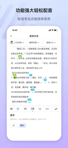 魔音工坊是一款主打 AI 智能配音的工具类 APP,适配视频配音、新闻播报、有声书录制、外语出海内容制作等多种场景,既受普通创作者青睐,也能满足团队的专业创作需求,还集成了视频剪辑、文案处理等配套功能,以下是其核心功能的详细介绍: