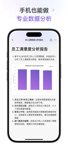 - 智能数据分析:用户上传Excel等数据文件后,可直接通过自然语言提问。AI将自动完成数据清洗与分析,并生成清晰的图表及洞察结论,是快速复盘和汇报的得力工具。
